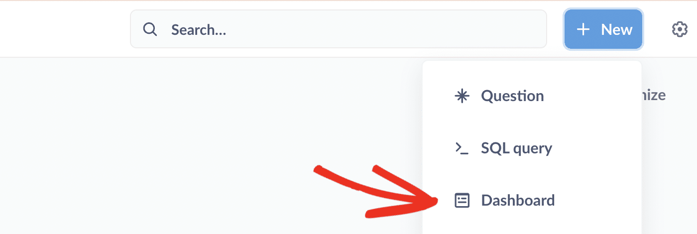 To create a new dashboard, click the + New button in the top right corner of your Metabase homepage and select Dashboard from the dropdown menu.
