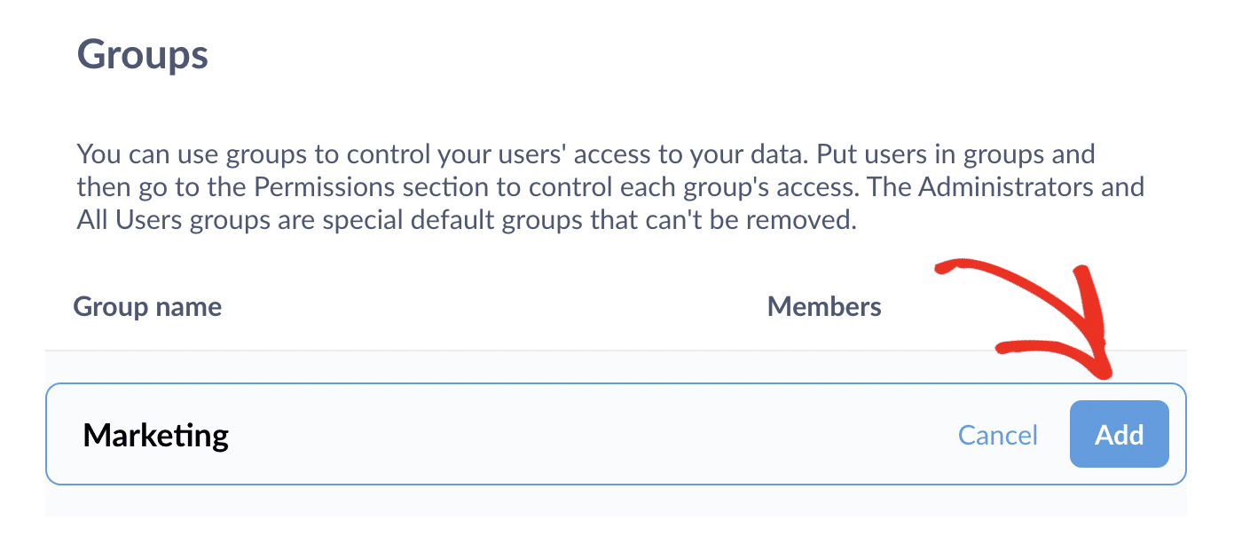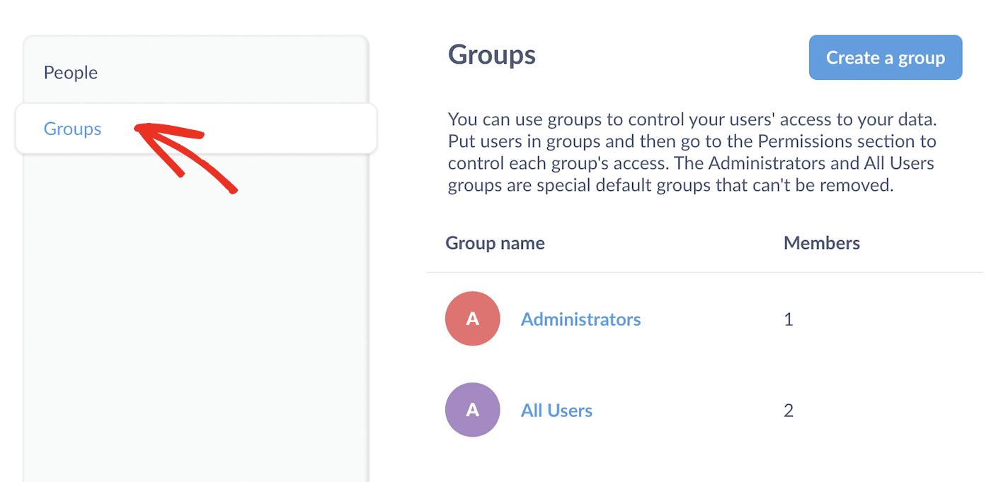 You can set user permissions by creating a group and adding users to the group. To see your groups and create new ones, navigate to Groups in the menu.