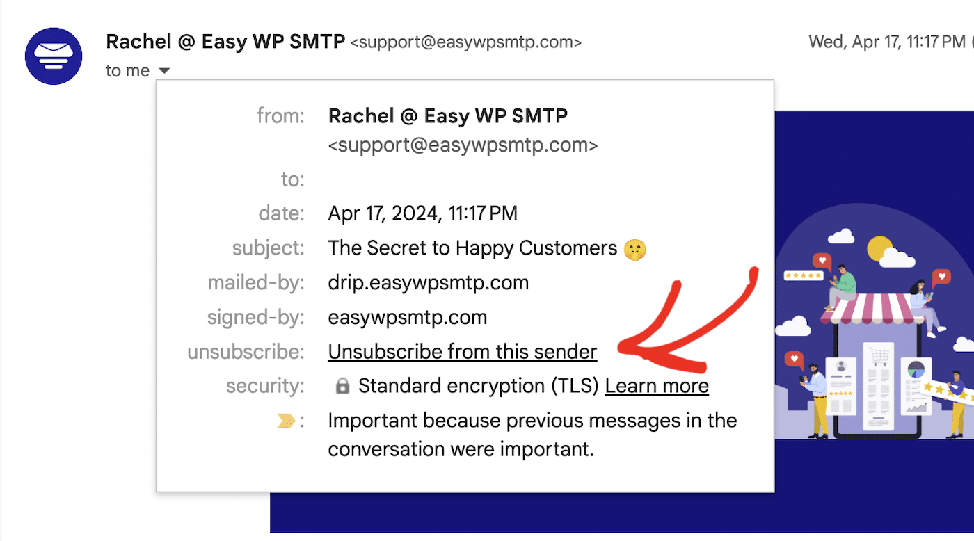 If you’re not sure if your emails have a list-subscribe header or if it’s configured correctly, you can send yourself a test email to see if the unsubscribe link appears when you receive the email (remember, you might have to click the dropdown arrow next to the sender name in Gmail to see this).