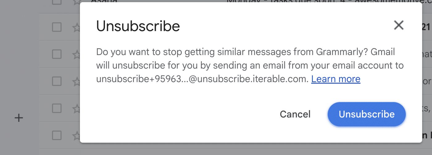 This gives email recipients a quick and easy way to opt out of unwanted emails without reading the content of the email or scrolling to the button to find an unsubscribe link.