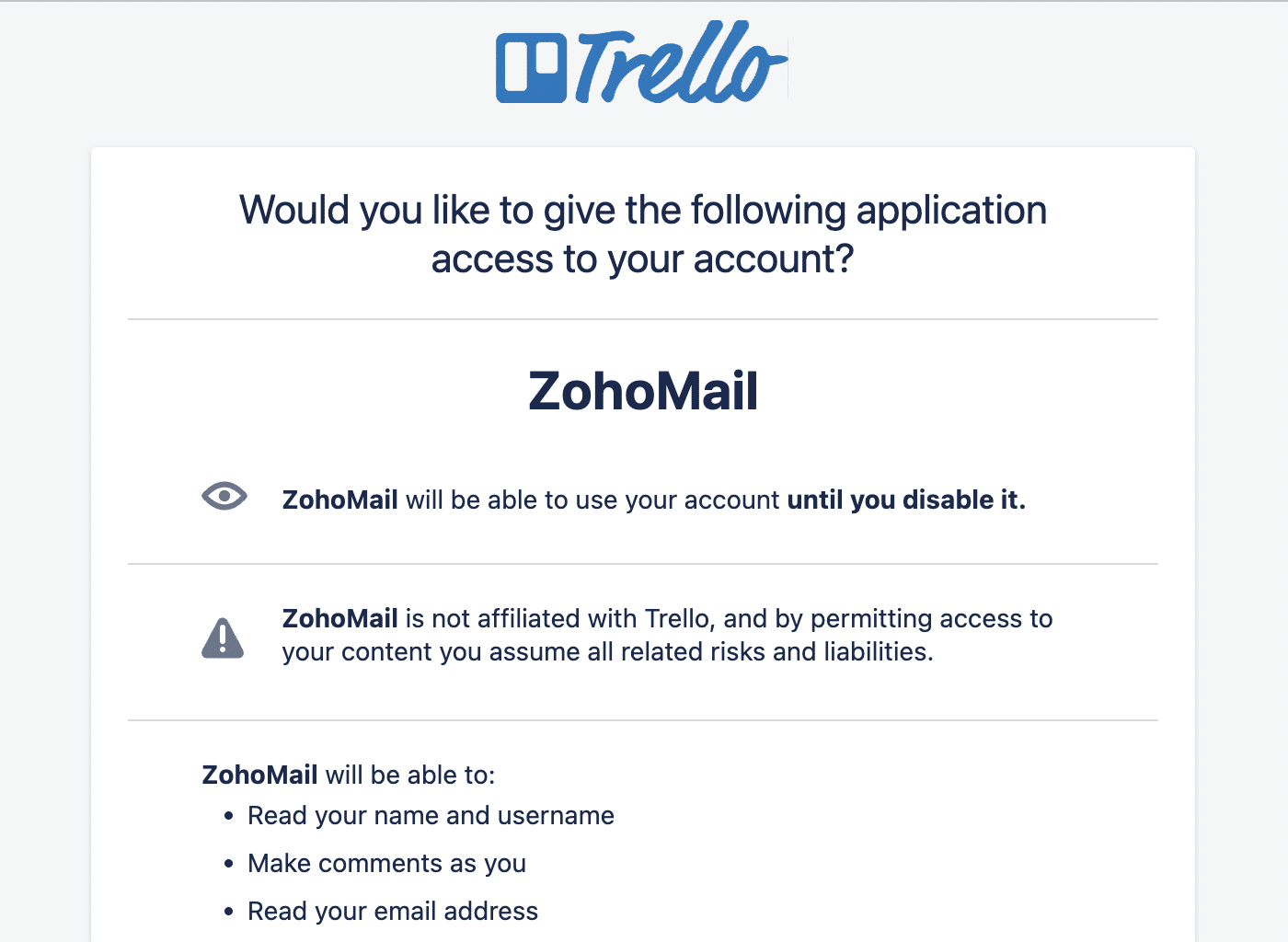 This will take you to a permissions page for your chosen app. Check the permissions you’re granting to ZohoMail and log into your account to grant the permissions.