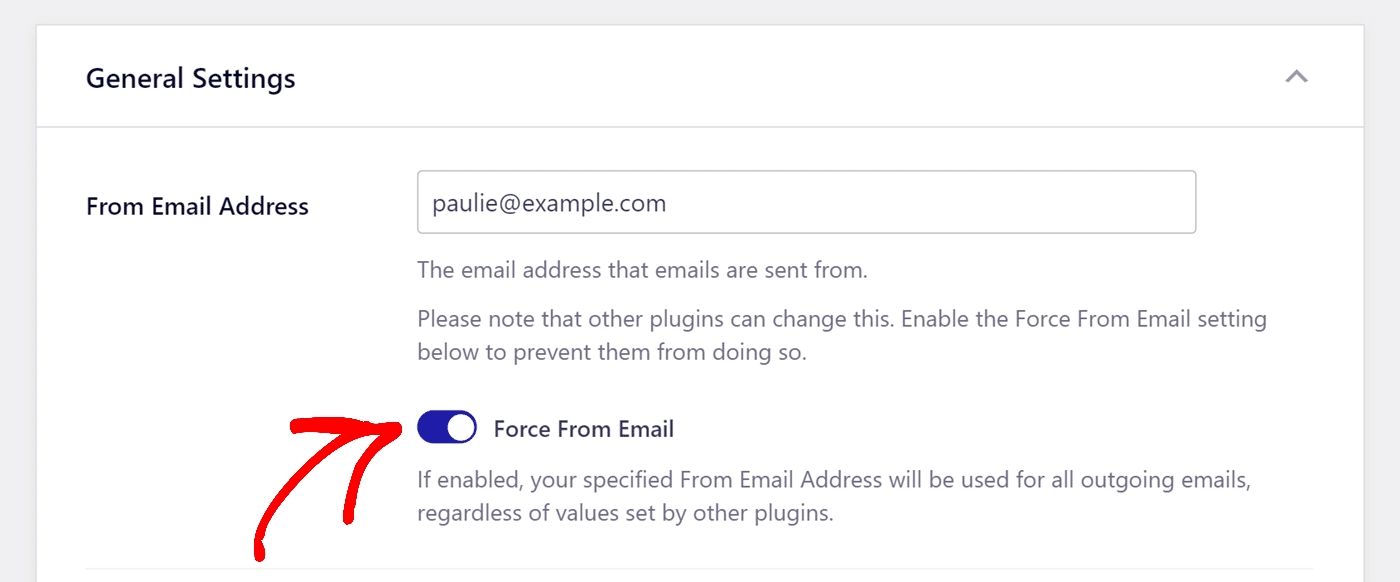 If you’re using a plugin like Easy WP SMTP, you can enable the ‘Force From Email’ option to ensure consistency. To do so, go to Easy WP SMTP » Settings and enable the Force From Email option.