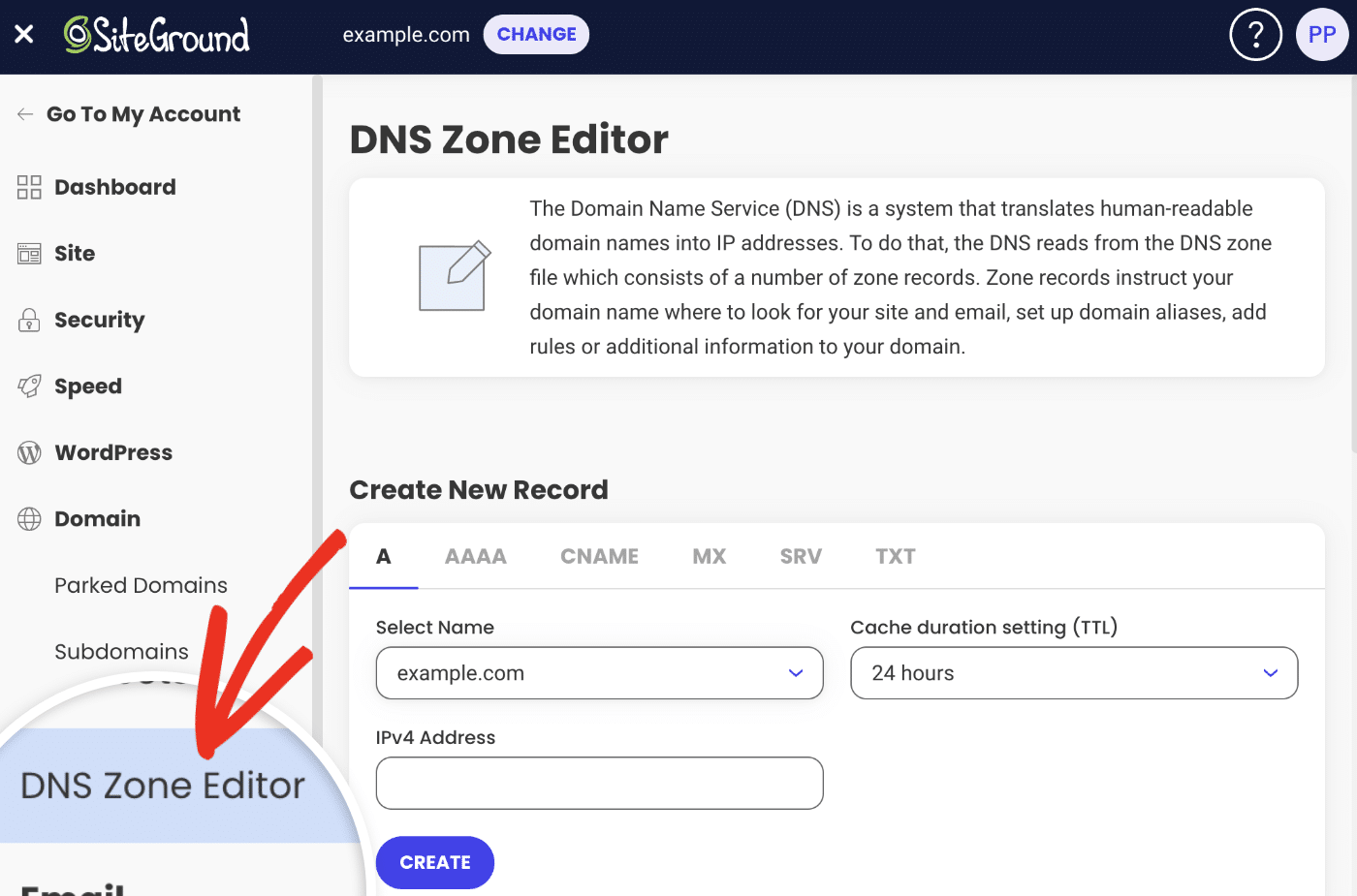As an example, we’ll add our first CNAME record to our SiteGround DNS settings.