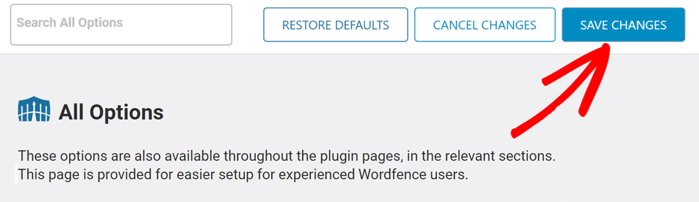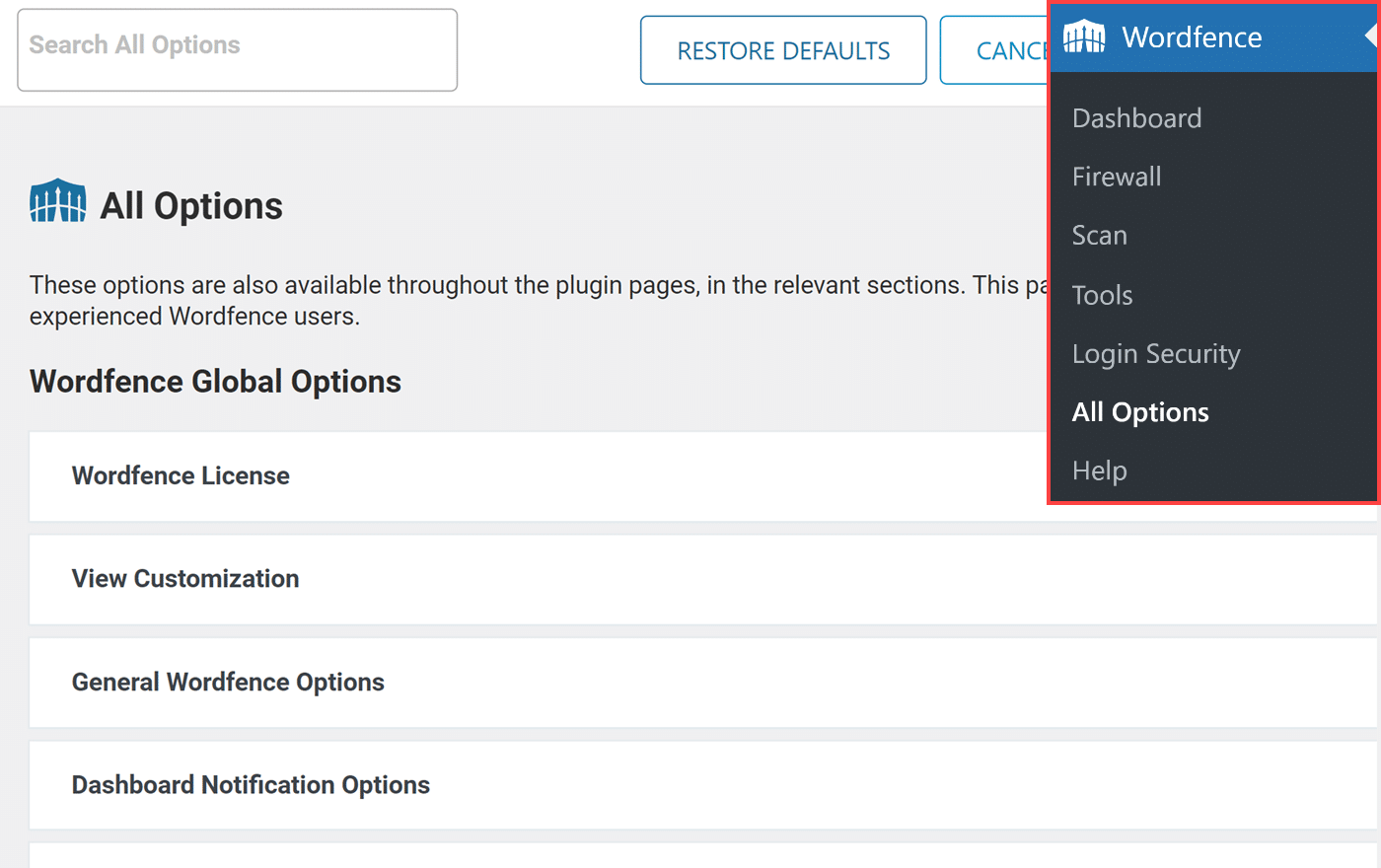 To start, log in to your WordPress admin dashboard and go to Wordfence » All Options.